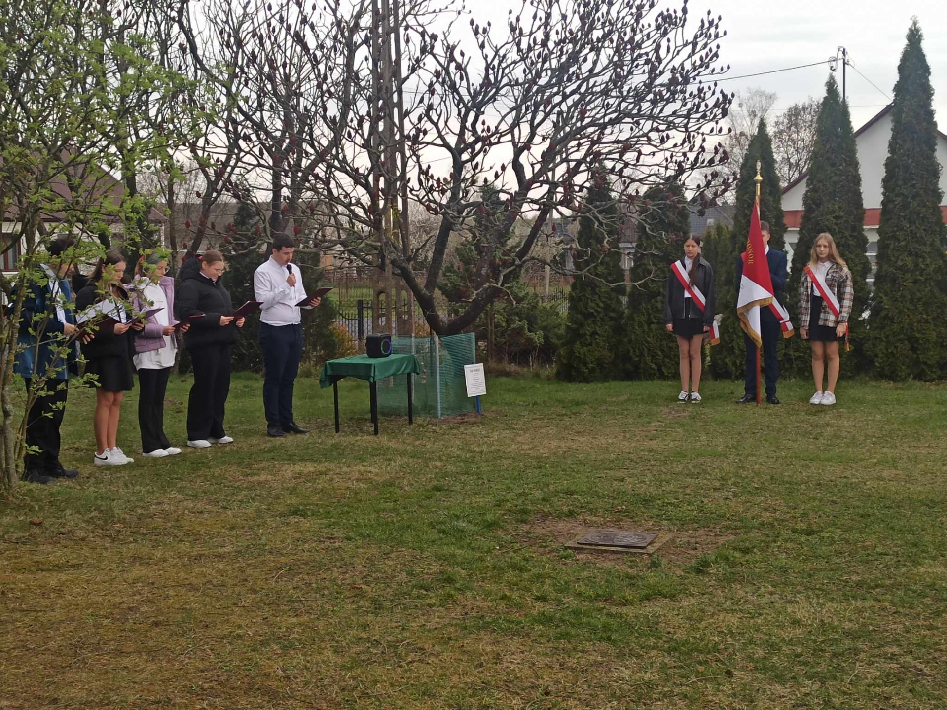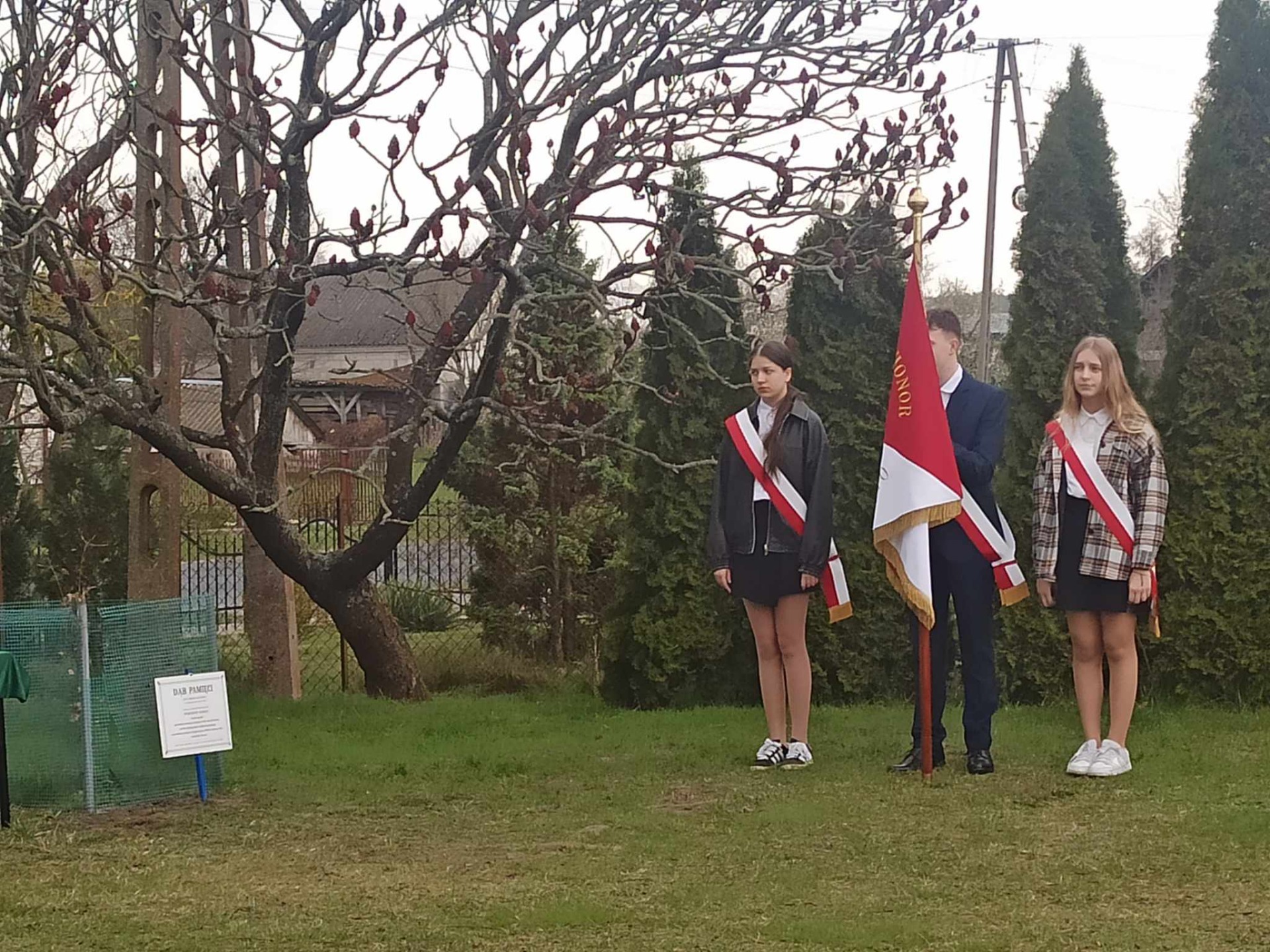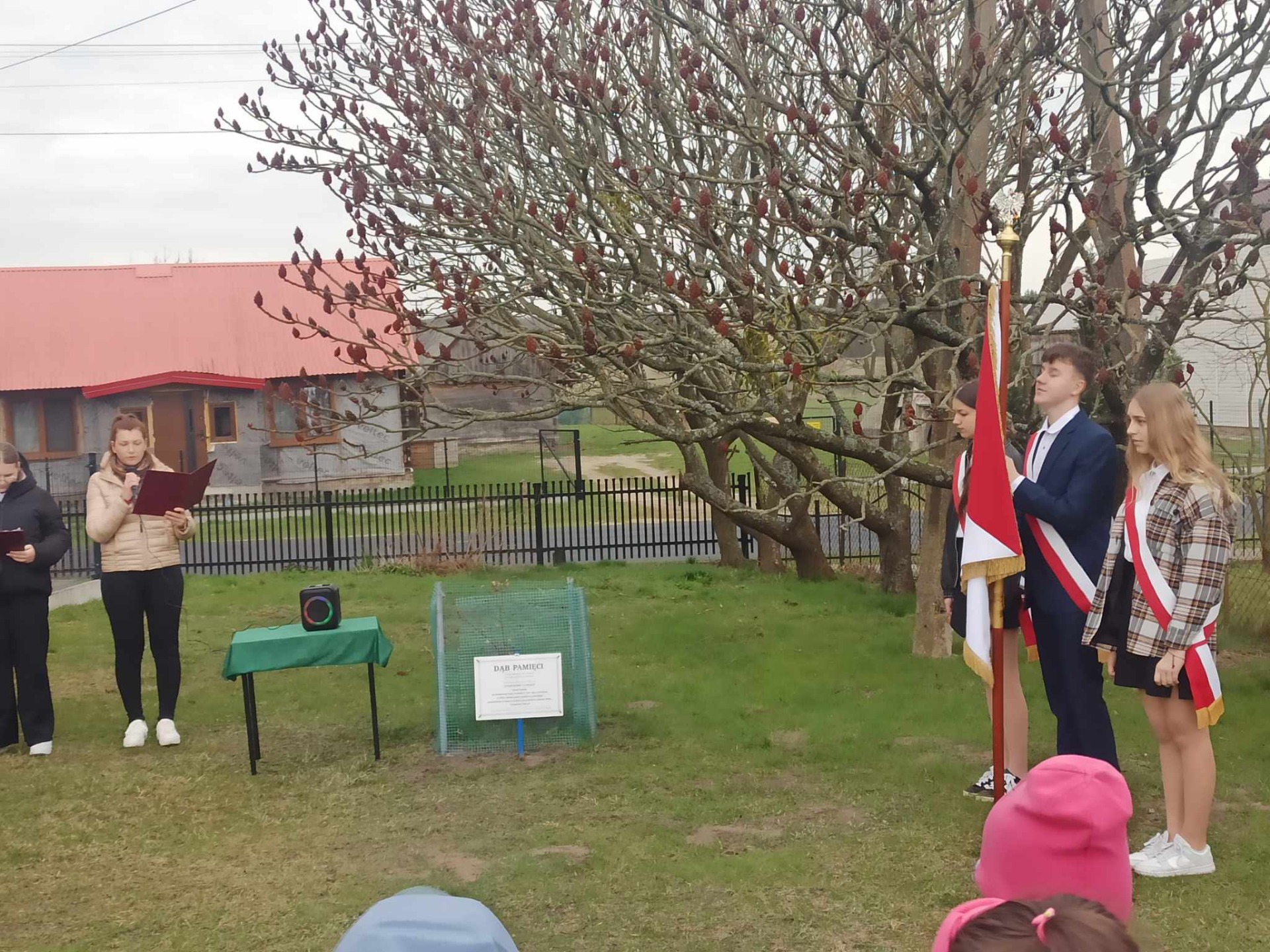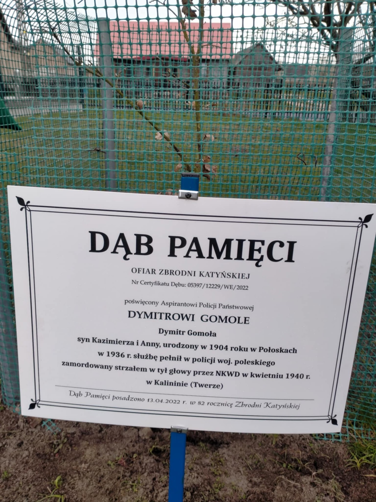 13 kwietnia obchodzimy corocznie Dzień Pamięci Ofiar Zbrodni Katyńskiej. Ustanowił go Sejm Rzeczypospolitej Polskiej w 2007 roku, aby podtrzymywać i przekazywać pamięć o Zbrodni Katyńskiej. Jedną z ofiar Zbrodni Katyńskiej był mieszkaniec naszej miejscowości: Dymitr Gomoła, syn Kazimierza i Anny urodzony w 1904 roku w Połoskach. Przed wybuchem II wojny światowej pełnił funkcję aspiranta Policji Państwowej. Wkrótce po agresji ZSRS na Polskę, w roku 1940, Dymitr Gomoła został aresztowany i uwięziony w obozie jenieckim w Ostaszkowie. Następnie został zamordowany przez NKWD w Kalininie (dziś: Twerze) strzałem w tył głowy. Nasza szkoła uczestniczy w programie edukacyjnym „Katyń… Ocalić od zapomnienia”. Dlatego też w roku 2022 posadziliśmy na terenie szkolnym Dąb Pamięci poświęcony postaci Dymitra Gomoły. Obowiązuje w całym kraju zasada : „jedno nazwisko z listy katyńskiej = jeden Dąb Pamięci”. 14 kwietnia b.r. delegacja uczniów z kl. 5,6,7 przybliżyła nam tę jedną z najtragiczniejszych kart z historii Polski, po czym minutą ciszy uczciliśmy pamięć Dymitra Gomoły i 22 tysięcy polskich ofiar Zbrodni Katyńskiej.