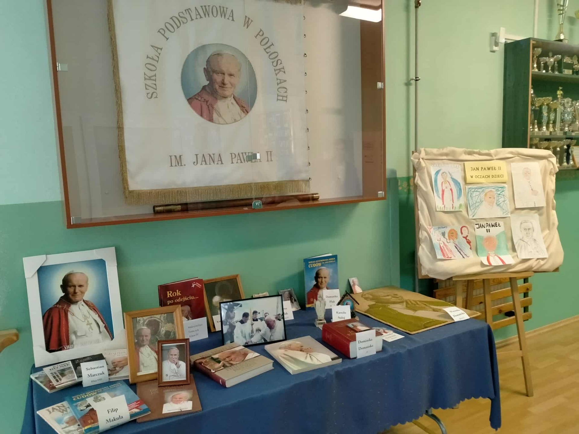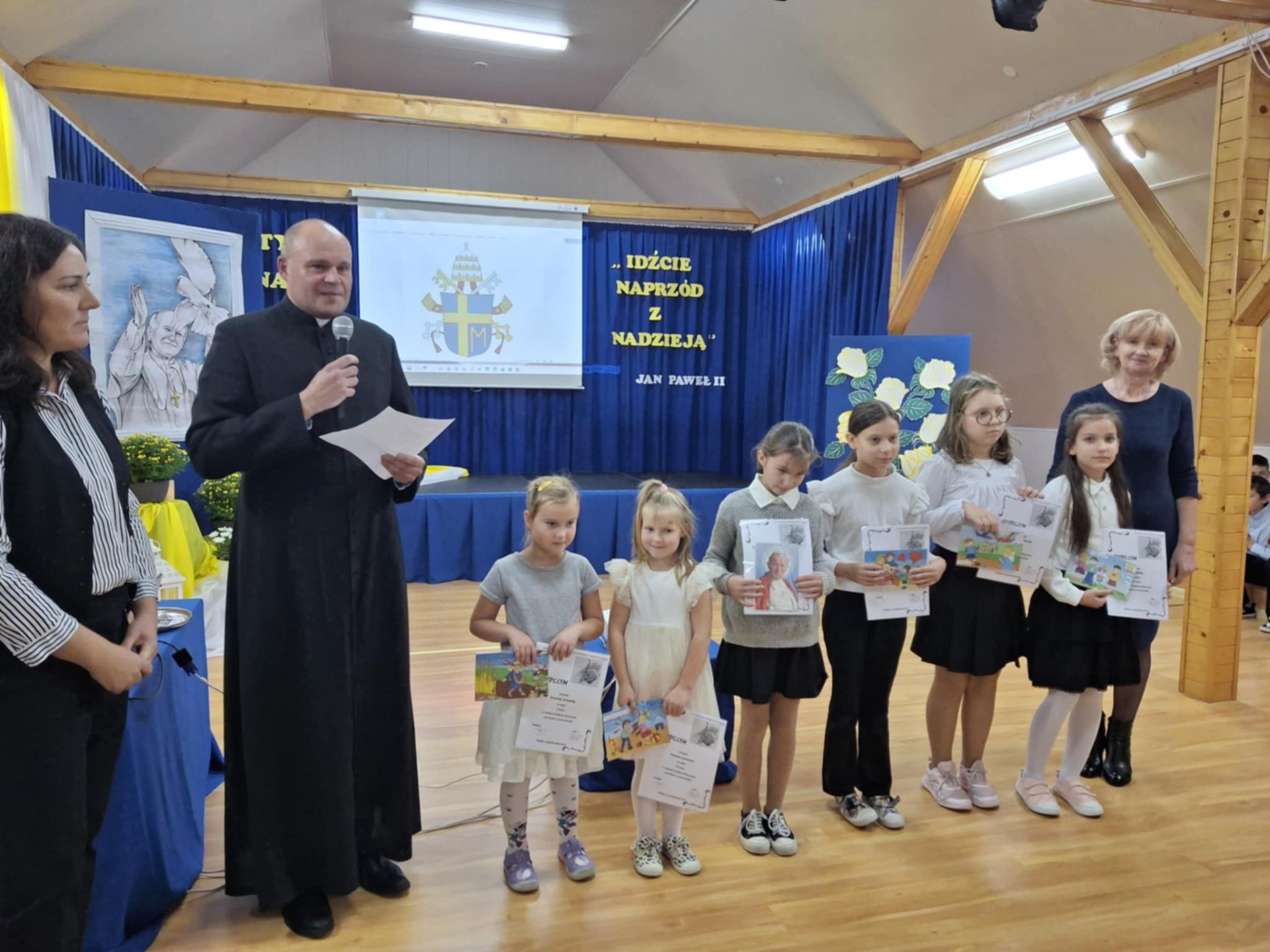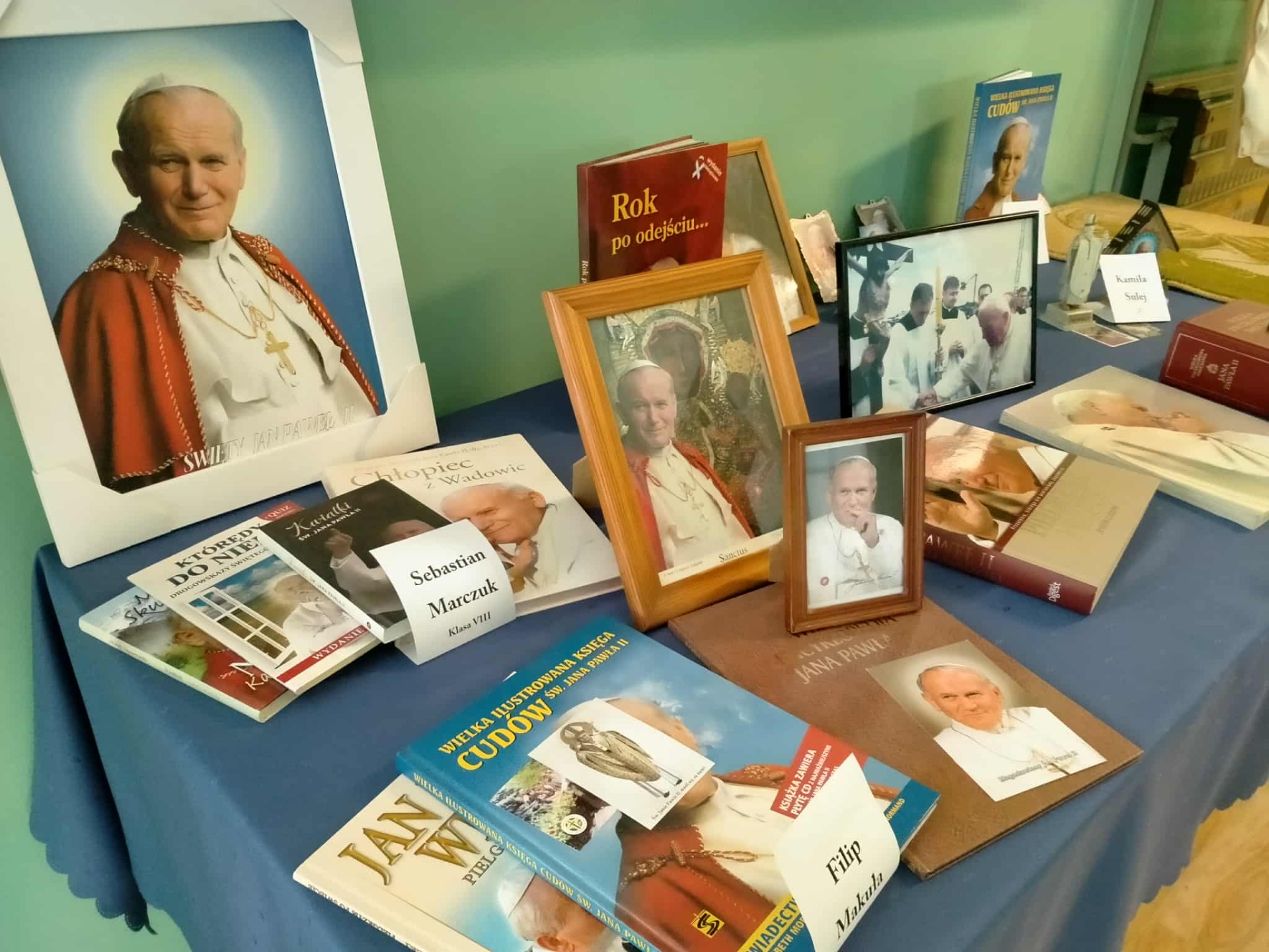 Laureatom wręczono dyplomy i upominki, a uczniowie, którzy przynieśli pamiątki związane z postacią Jana Pawła II na szkolną wystawkę, otrzymali podziękowania i drobne niespodzianki.