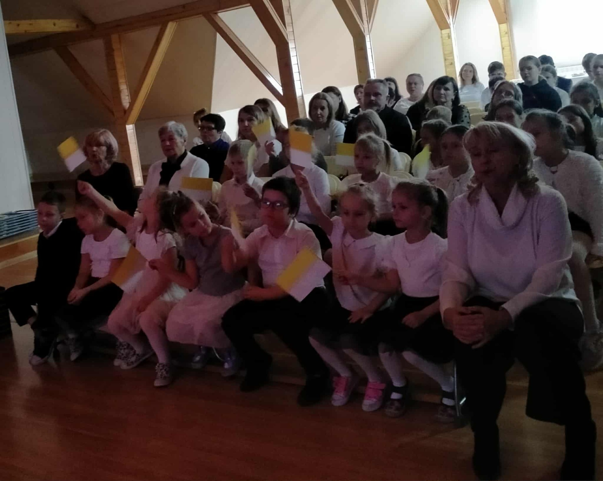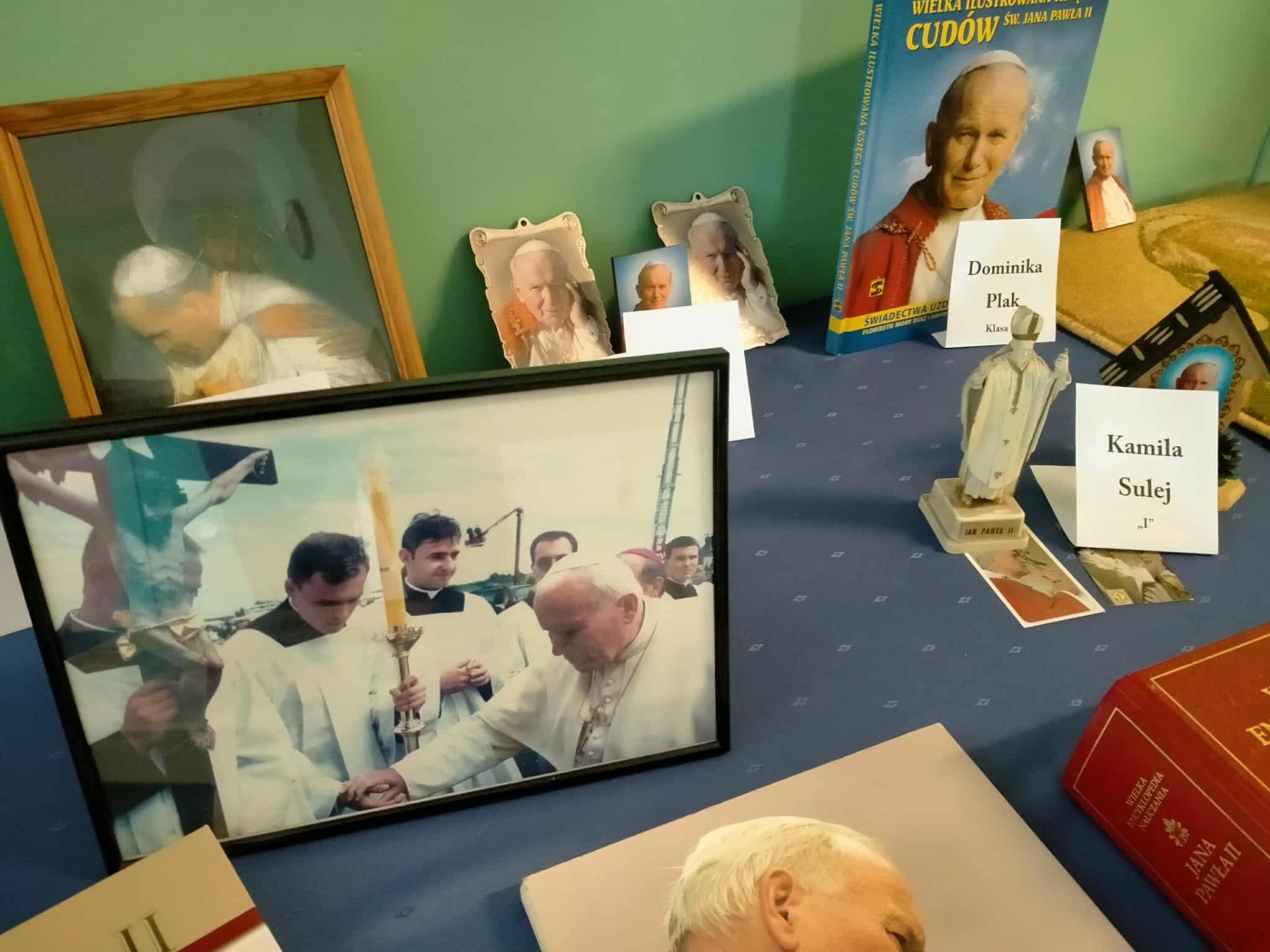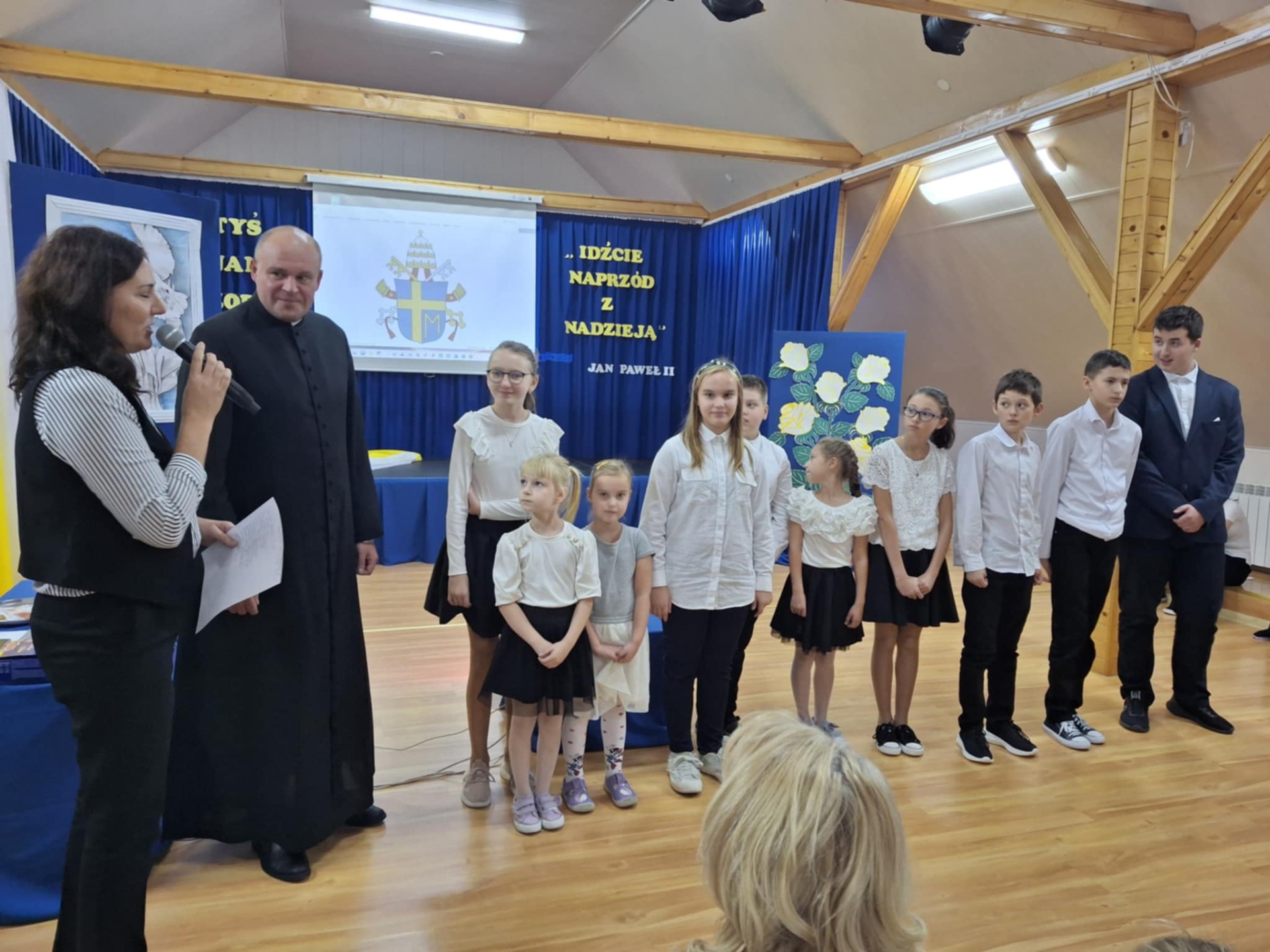 Laureatom wręczono dyplomy i upominki, a uczniowie, którzy przynieśli pamiątki związane z postacią Jana Pawła II na szkolną wystawkę, otrzymali podziękowania i drobne niespodzianki.