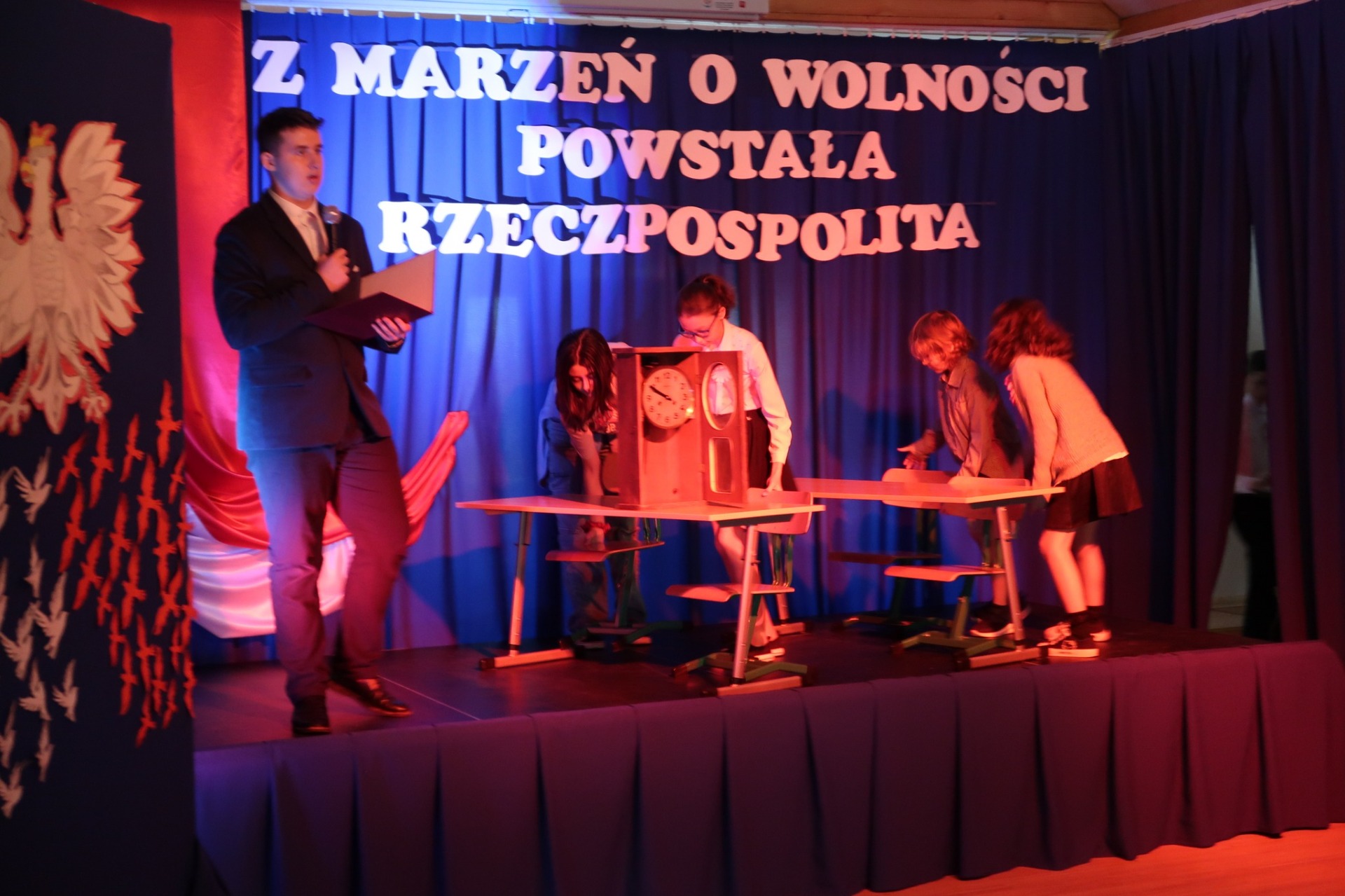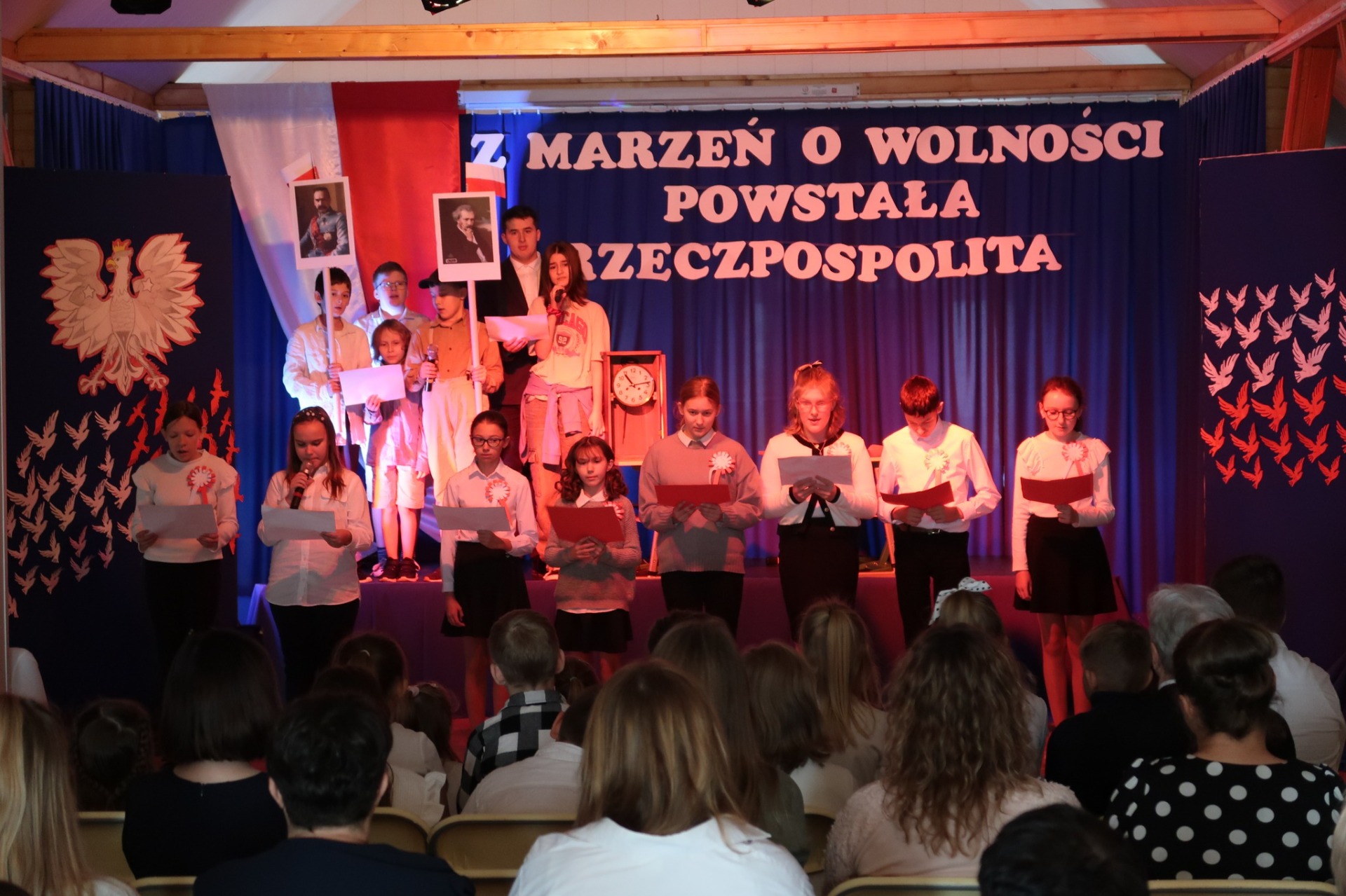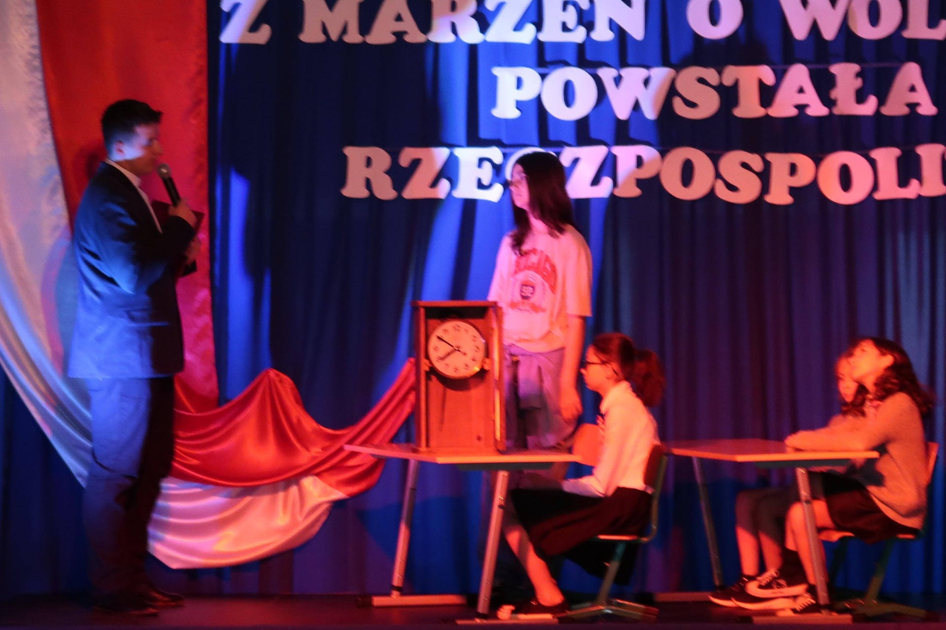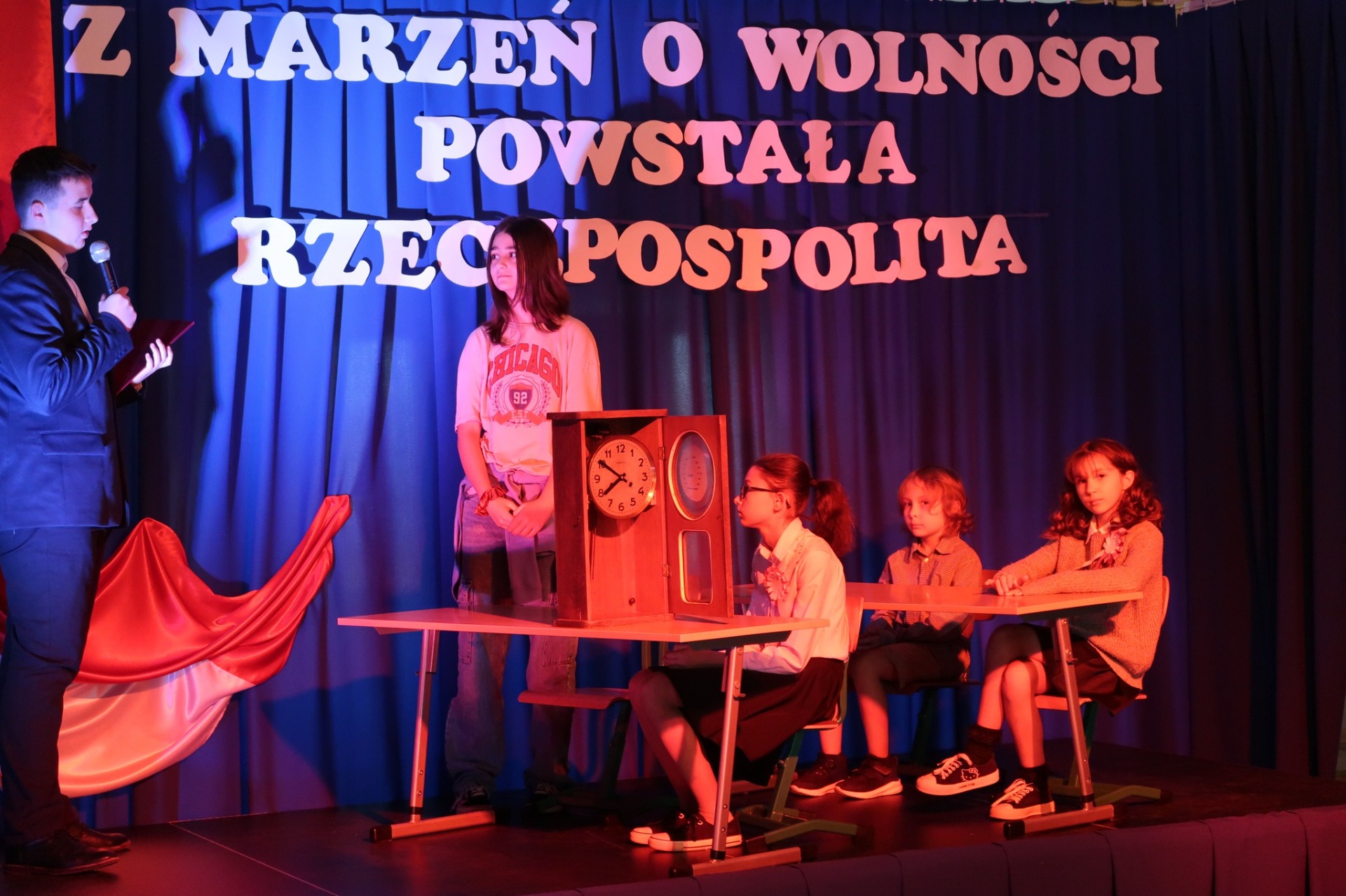 Przedstawieniem teatralnym uczciliśmy w naszej szkole 107. rocznicę odzyskania przez Polskę niepodległości. Widzowie odbyli niezwykłą podróż w czasie: zobaczyli fragmenty wydarzeń z przeszłości i odczuli emocje, jakie towarzyszyły naszym rodakom przez 123 lata zaborów, kiedy Polacy nie mogli swobodnie mówić w języku polskim ani uczyć się w języku ojczystym i byli zmuszeni do walki o niepodległość państwa, niejednokrotnie poświęcając swoje życie.